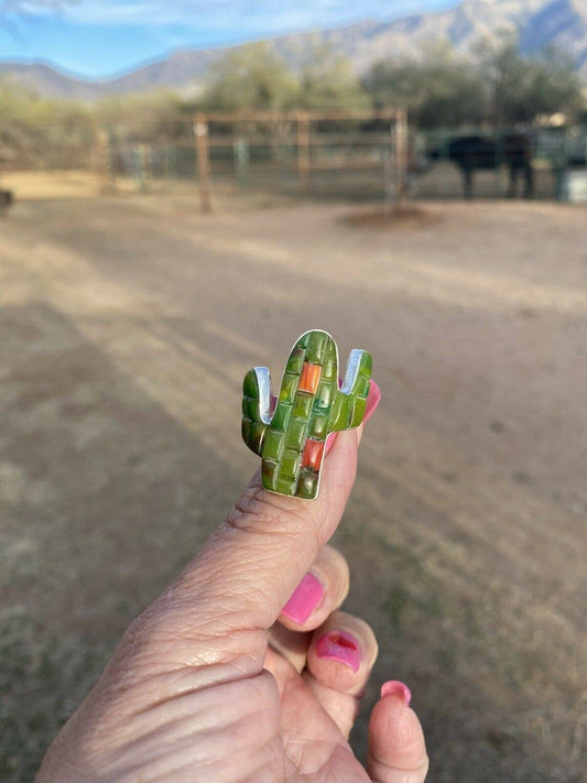 Native signed & stamped, Turquoise & Spiny Sterling Silver Handmade Inlay Saguaro Ring