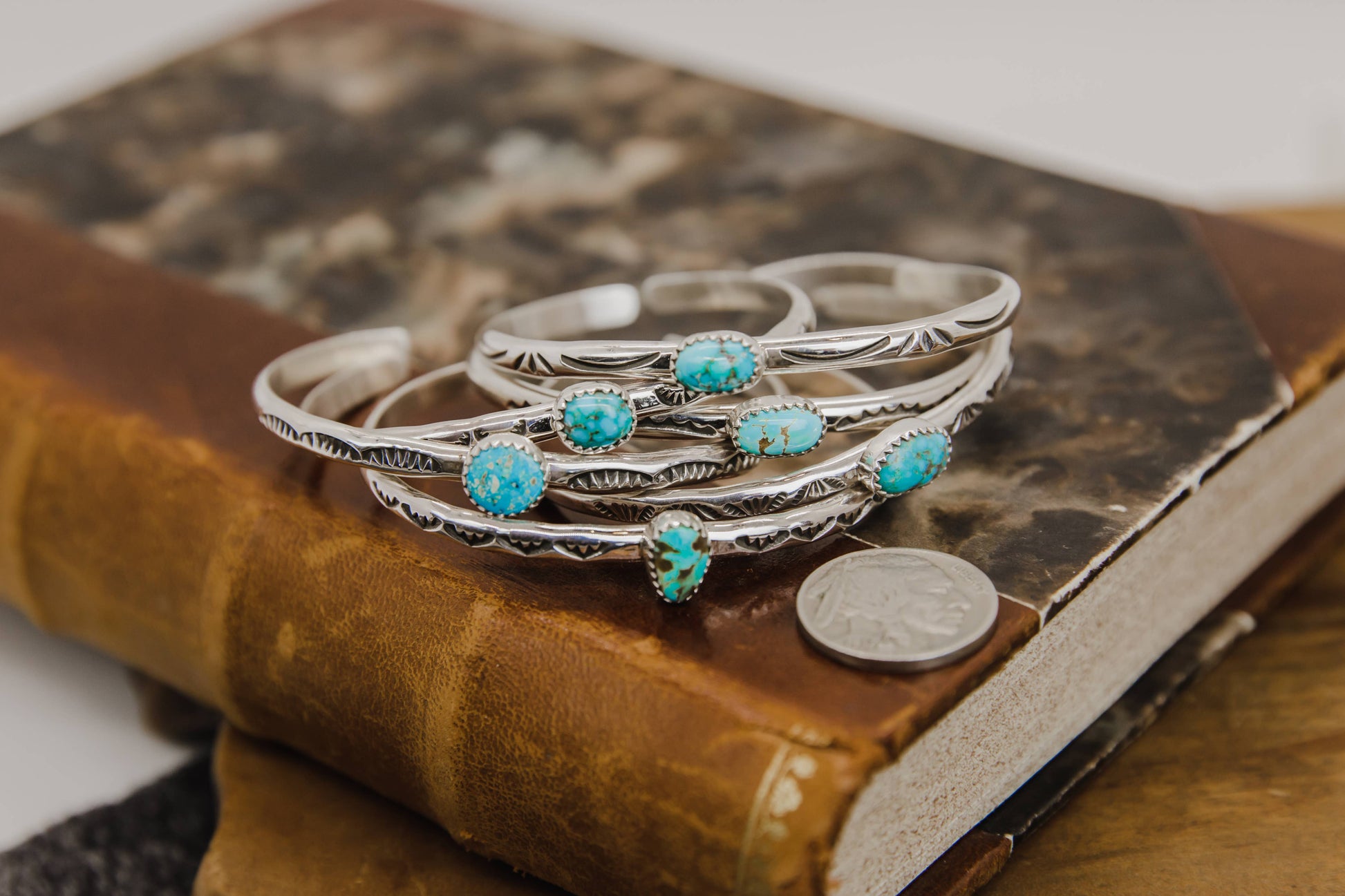 These sturdy yet dainty hand stamped bracelets are a favorite gift item in our shop. We keep a dozen in stock at all times. Each has unique stamp work, genuine turquoise, and is made with pure sterling silver. Hand made in New Mexico.