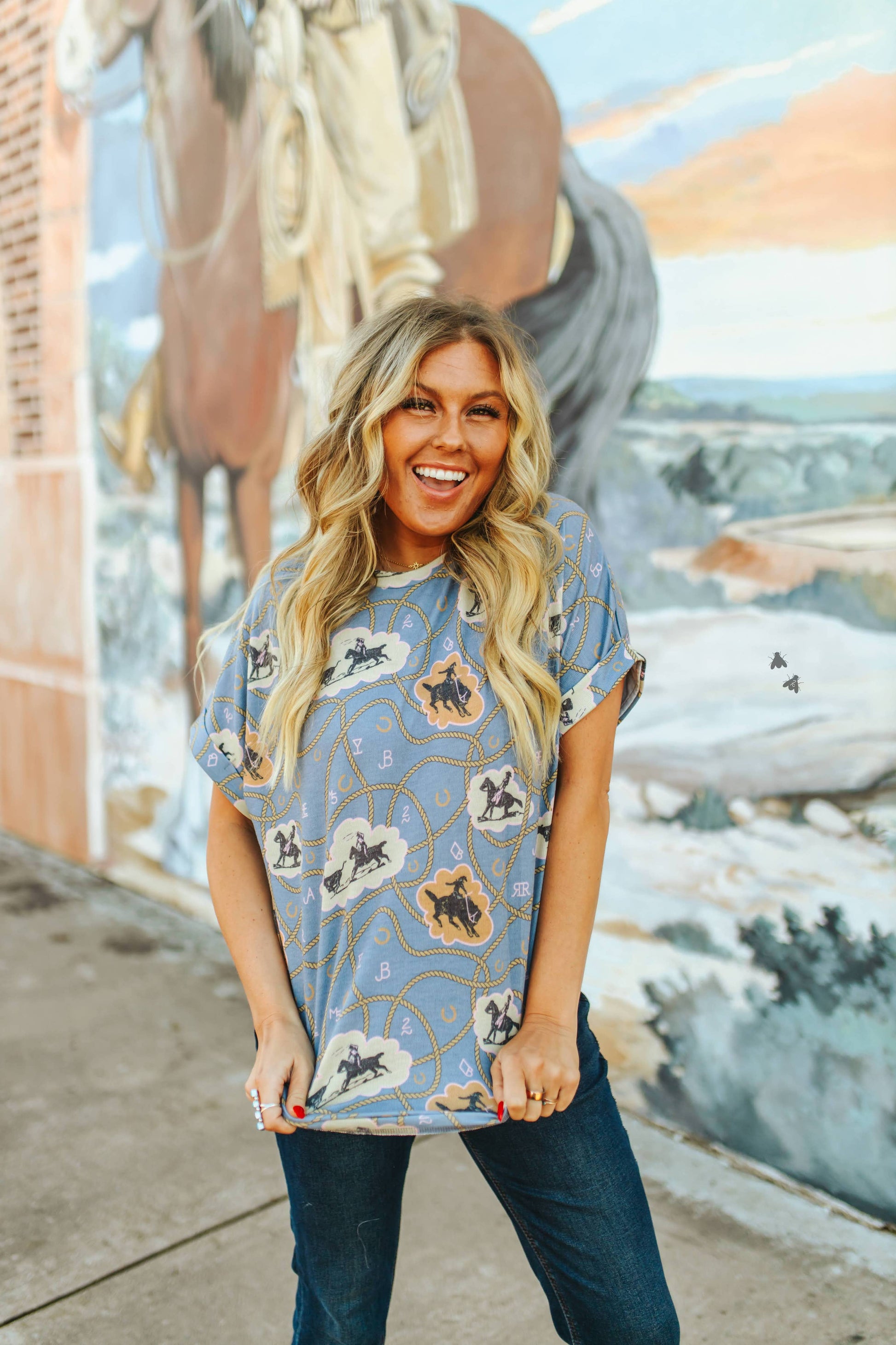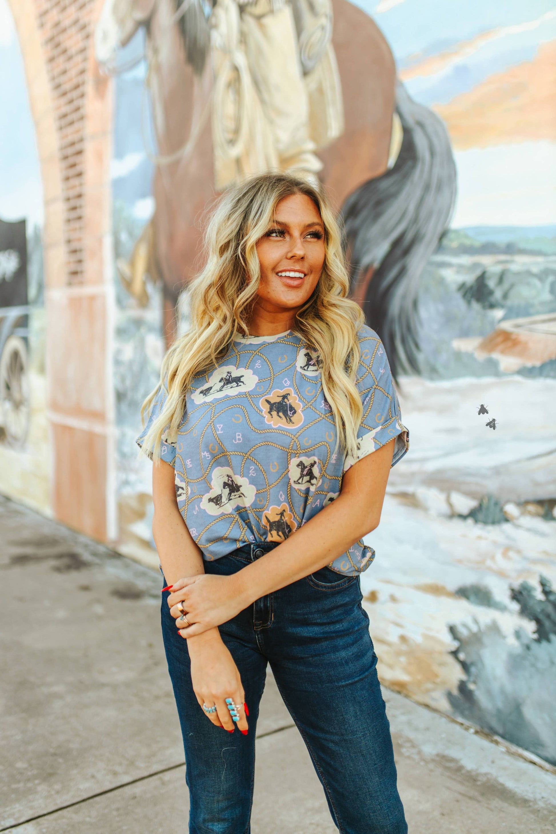 The Rancher Threads T-shirt from 2 Fly Co, a brand that embraces both the Western and the Weird, is a versatile addition to any wardrobe. The shirt, hand-drawn with original designs, offers a unique blend of comfort and style that transcends trends. Suitable for a variety of occasions, this women's tee is crafted to last, becoming a cherished item rather than a disposable fashion piece. Available in sizes XS to 3X. Join the 2 Fly Co family and stay fly with this timeless T-shirt.