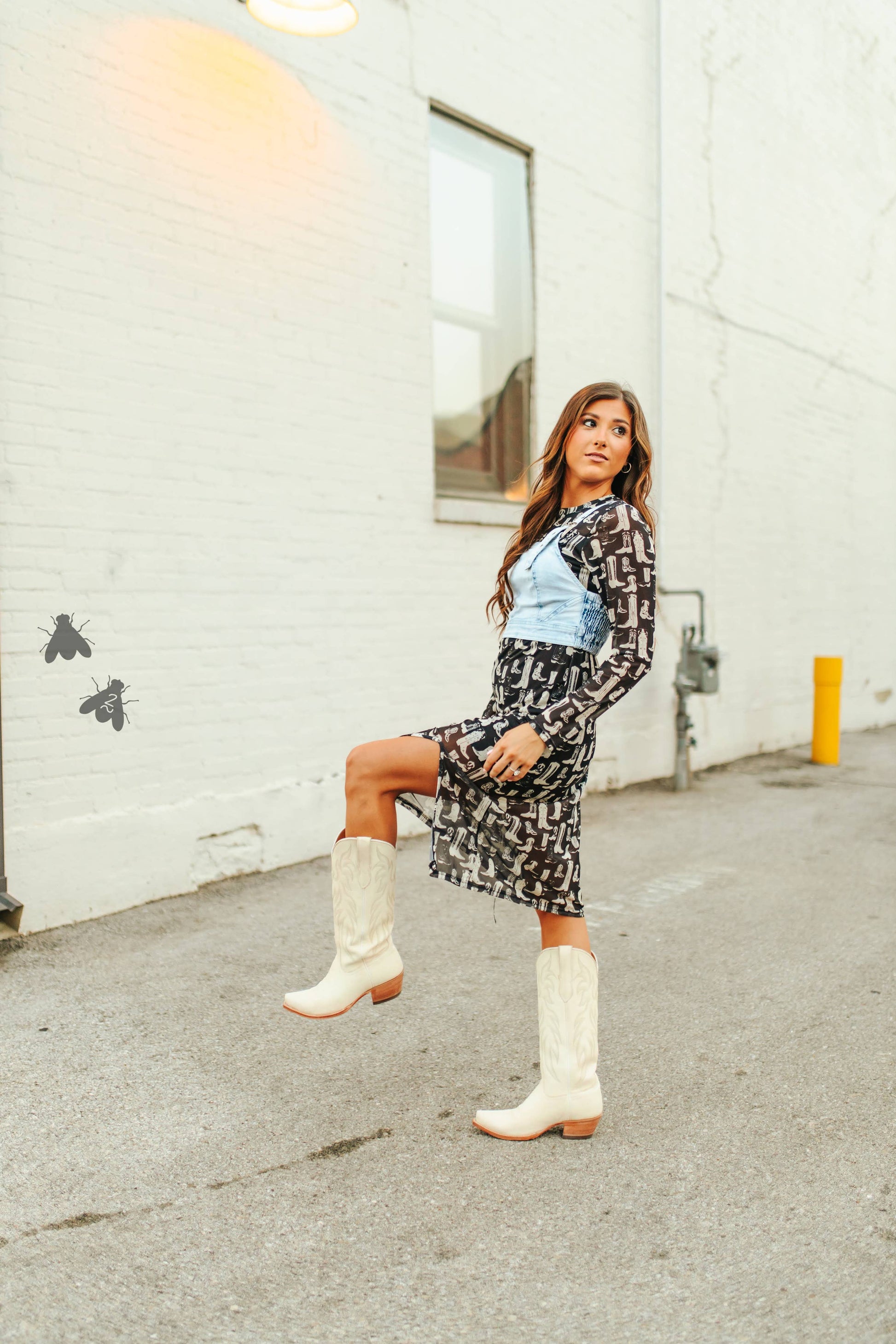 Unveiling the WE BE SCOOTIN' MESH dress, a unique creation from 2 Fly Co. This piece is a testament to the brand's commitment to originality and enduring style. Designed with a blend of Western and a touch of weird, it's a dress that stands out from the rest. It's not just about following the trends, it's about creating timeless pieces that will be cherished for generations. This dress is a perfect representation of 2 Fly Co's all-inclusive ethos, available in sizes XS to 3X. Join the fam, stay fly with this distinctive piece.